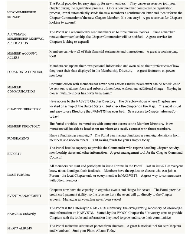 NABVETS Chapters that participate in the Portal can access a broad range of services, including the following: